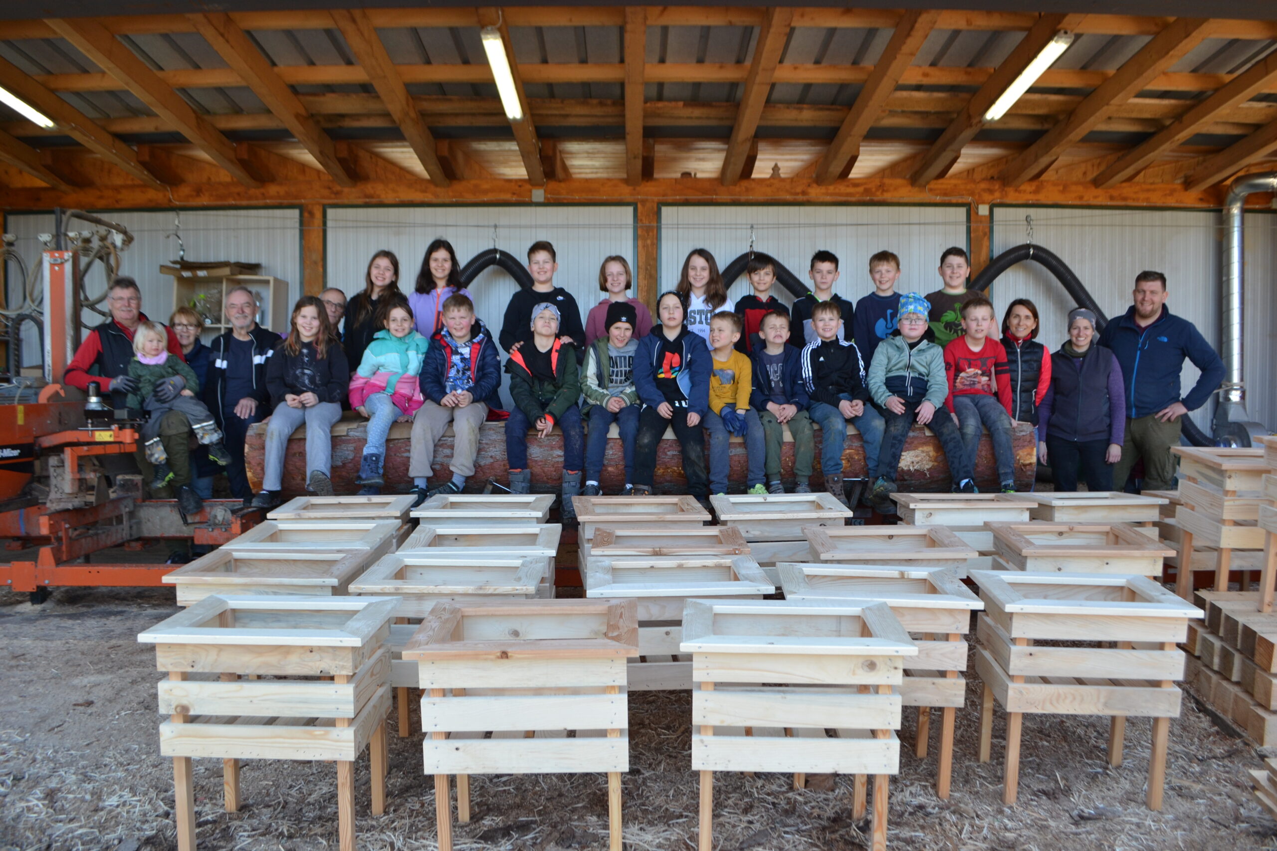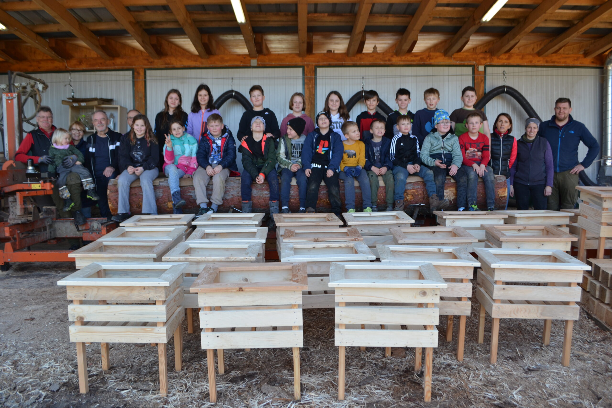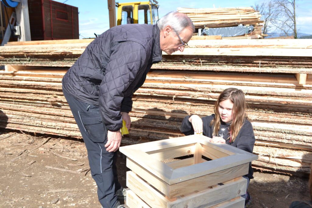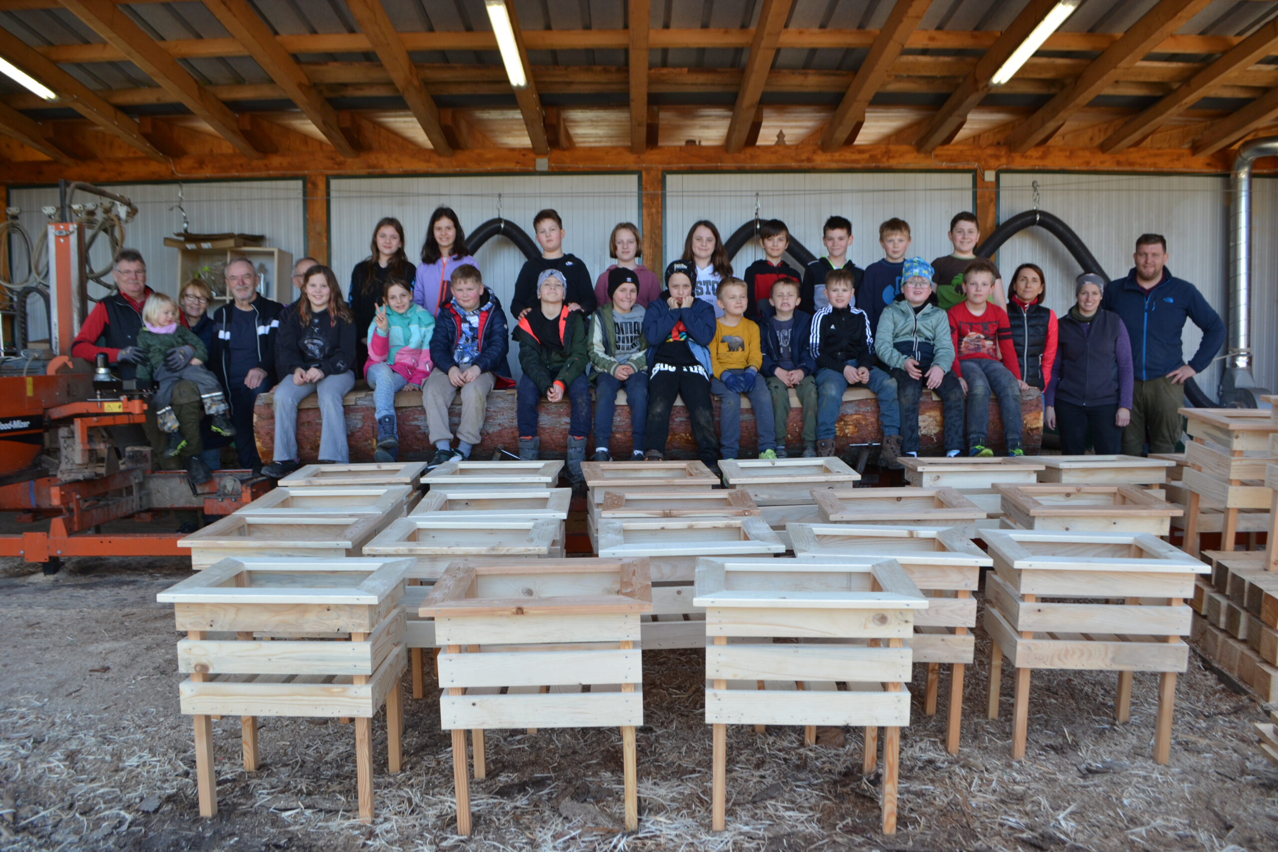Einen ganz besonderen Schultag durften die Kinder der 2. Klasse und der 4a Klasse bei der Familie von Frau Lehrerin Karoline Omelko verbringen. Familie Omelko besitzt ein Sägewerk und zeigte den Kindern zunächst, wie aus einem Stamm Bretter geschnitten und gehobelt werden. Danach durfte sich jedes Kind aus den bereits vorbereiteten Brettern ein eigenes Hochbeet-Kisterl bauen. Dank der perfekten Vorbereitung und der zusätzlichen Unterstützung von Herrn Bierbaumer und von Anjas und Pauls Opa konnte hat nun jedes Kind SEIN Kisterl.