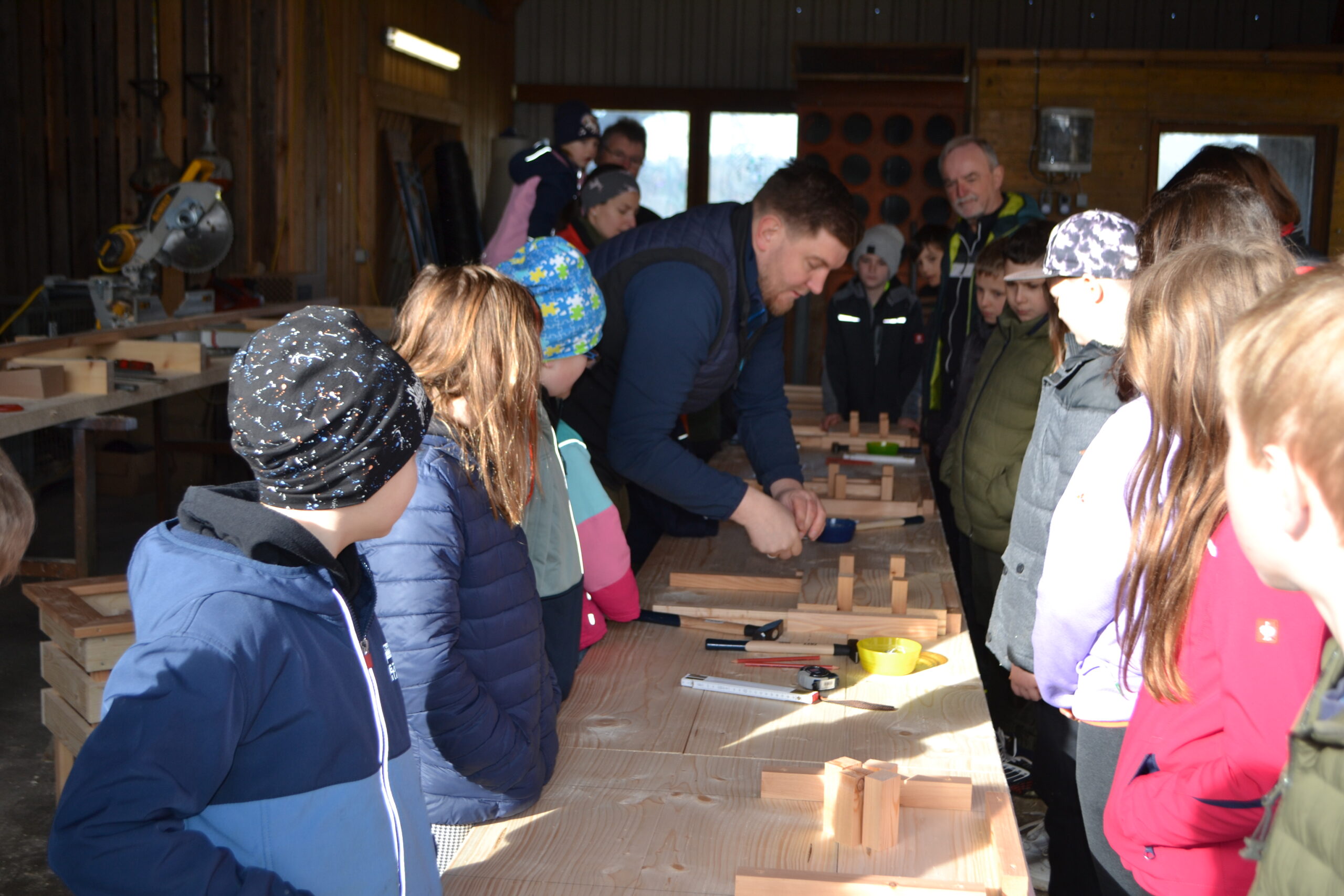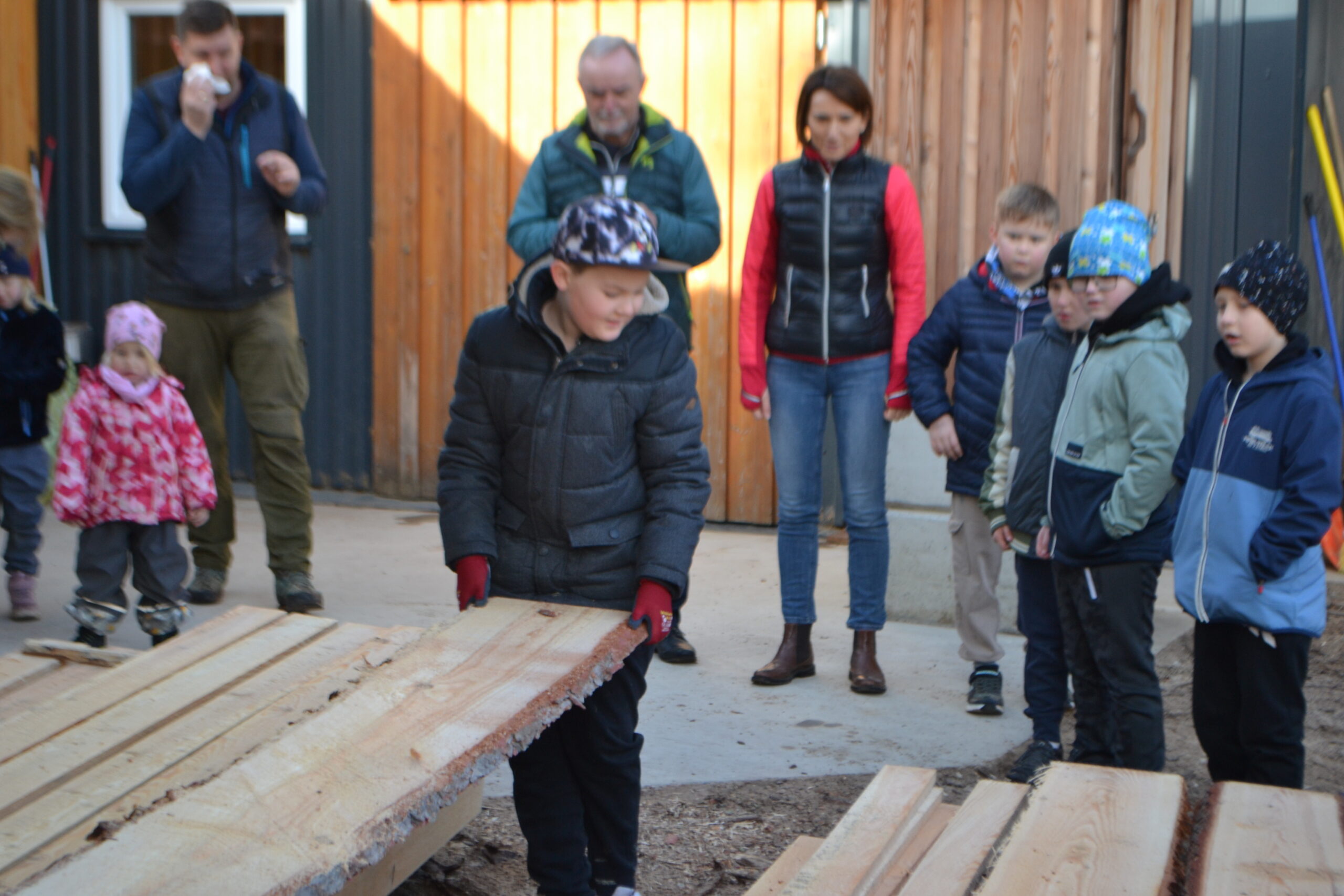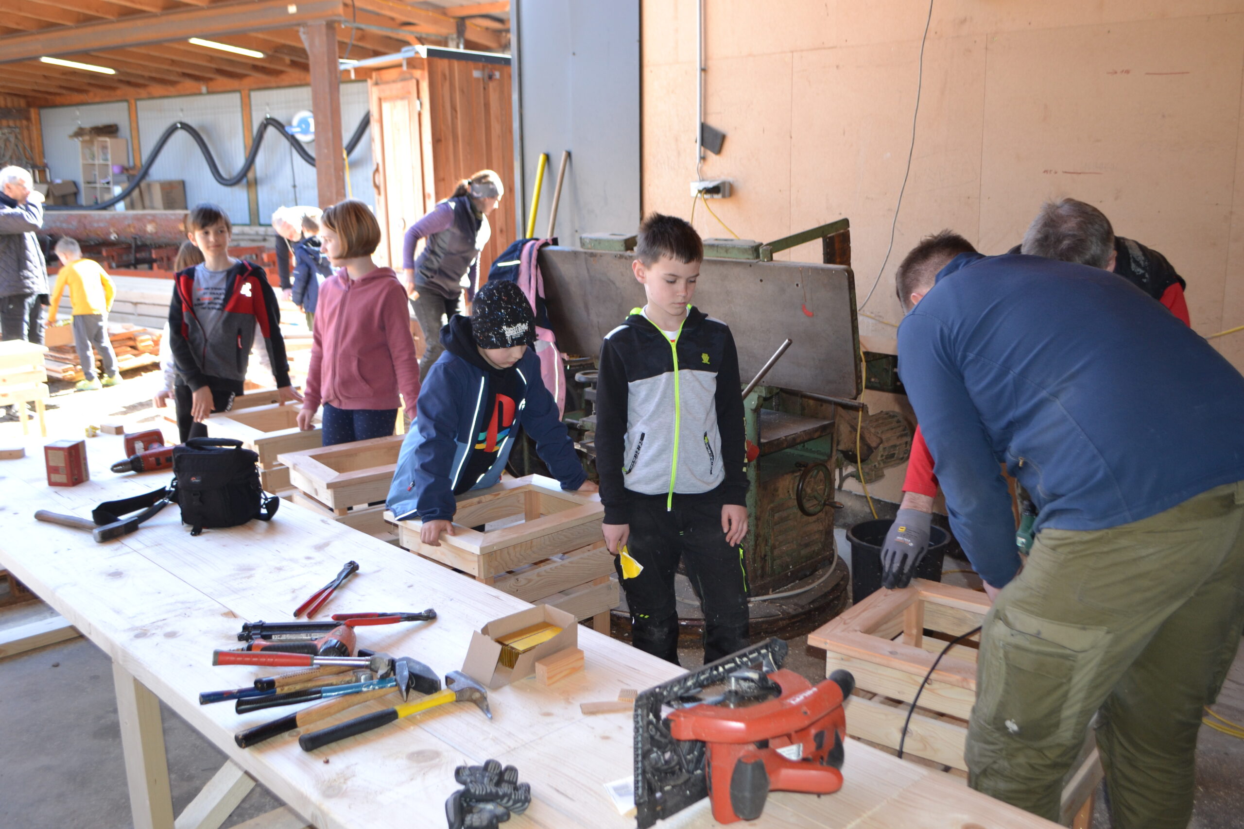 Einen ganz besonderen Schultag durften die Kinder der 2. Klasse und der 4a Klasse bei der Familie von Frau Lehrerin Karoline Omelko verbringen. Familie Omelko besitzt ein Sägewerk und zeigte den Kindern zunächst, wie aus einem Stamm Bretter geschnitten und gehobelt werden. Danach durfte sich jedes Kind aus den bereits vorbereiteten Brettern ein eigenes Hochbeet-Kisterl bauen. Dank der perfekten Vorbereitung und der zusätzlichen Unterstützung von Herrn Bierbaumer und von Anjas und Pauls Opa konnte hat nun jedes Kind SEIN Kisterl.