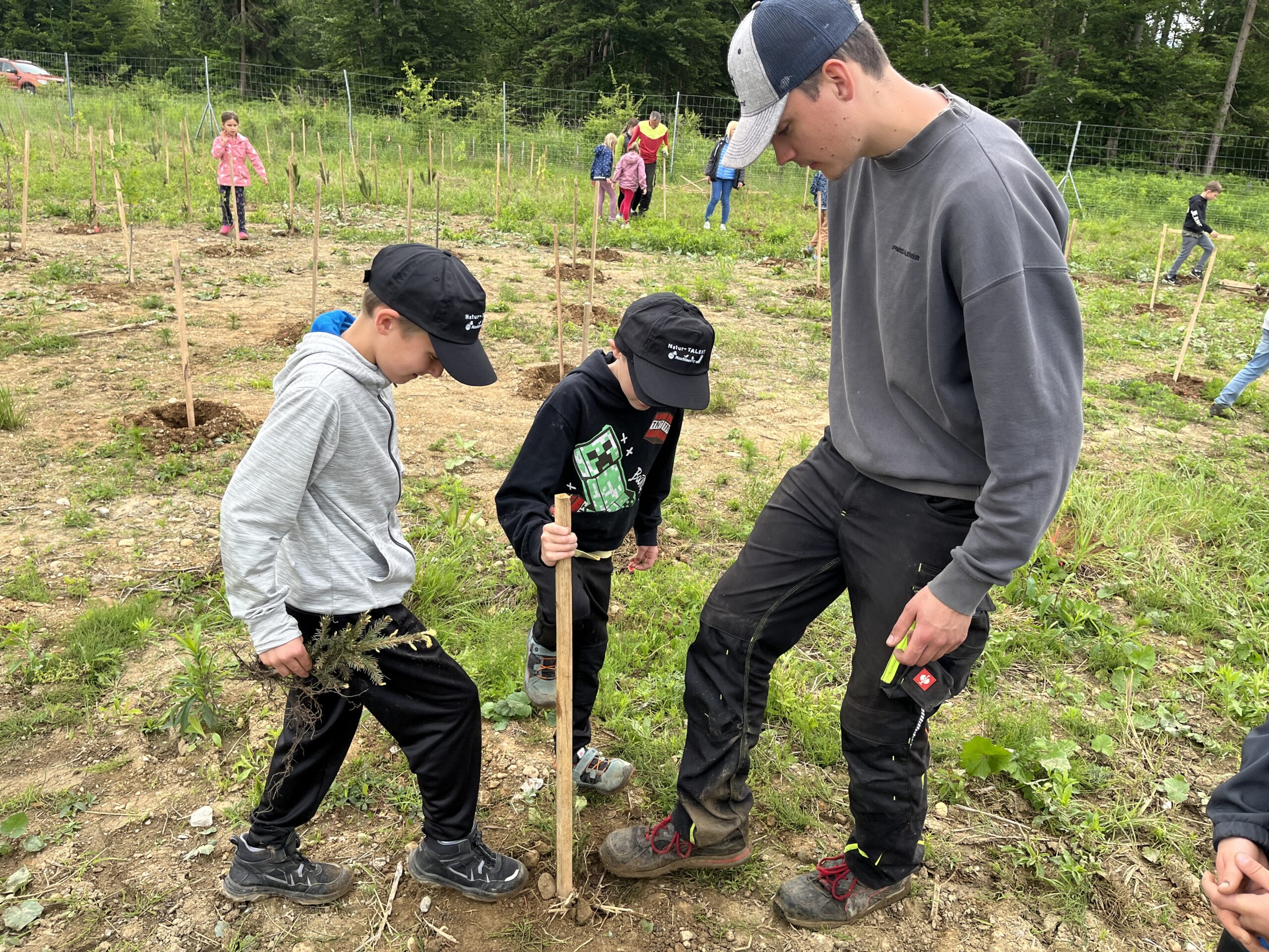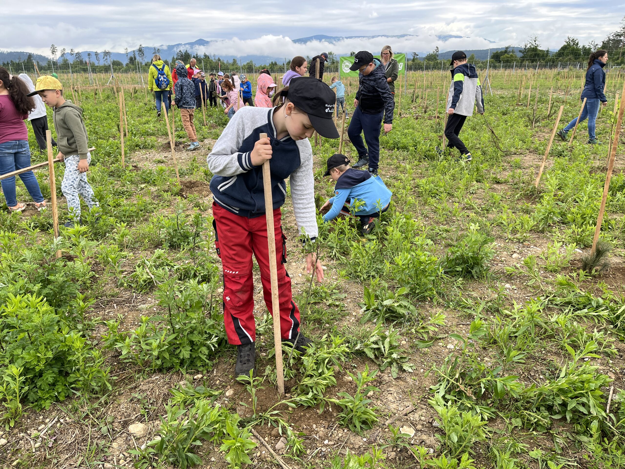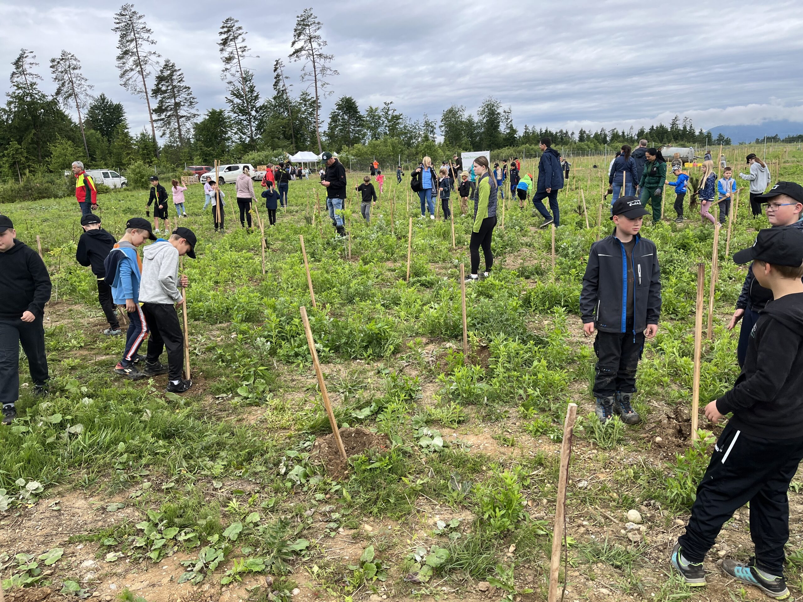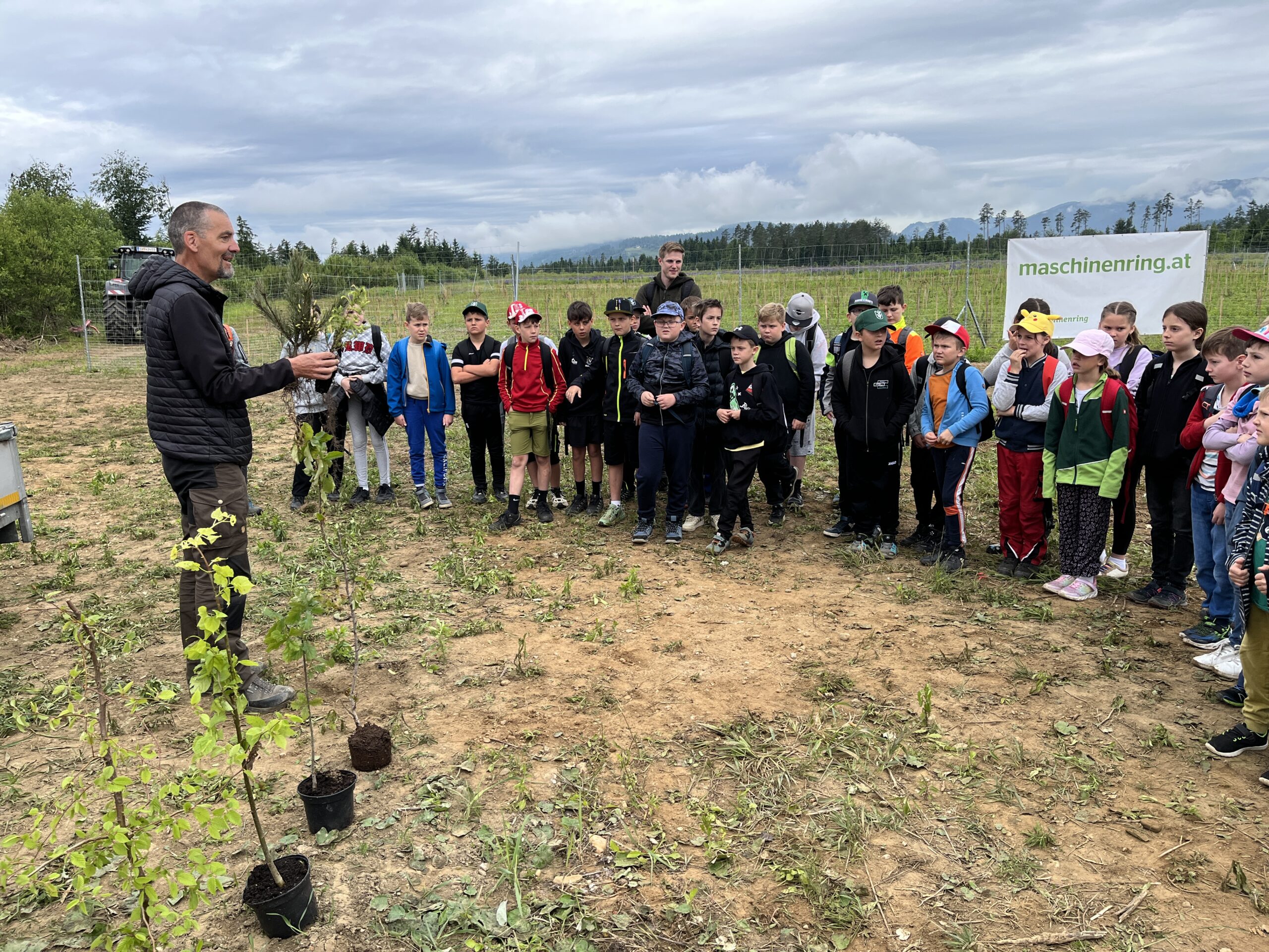 Die ÖBB mussten viele Bäume fällen, weil eine neue Zugstrecke nach Graz gebaut wurde. Deshalb werden nun an der Stelle vom Maschinenring neue Bäume gepflanzt. Dabei durften die Kinder der 3. und 4. Klasse einen Vormittag lang helfen. Wir pflanzten Fichten, Eichen, Föhren, Linden, Kirschen, Lärchen und Buchen.