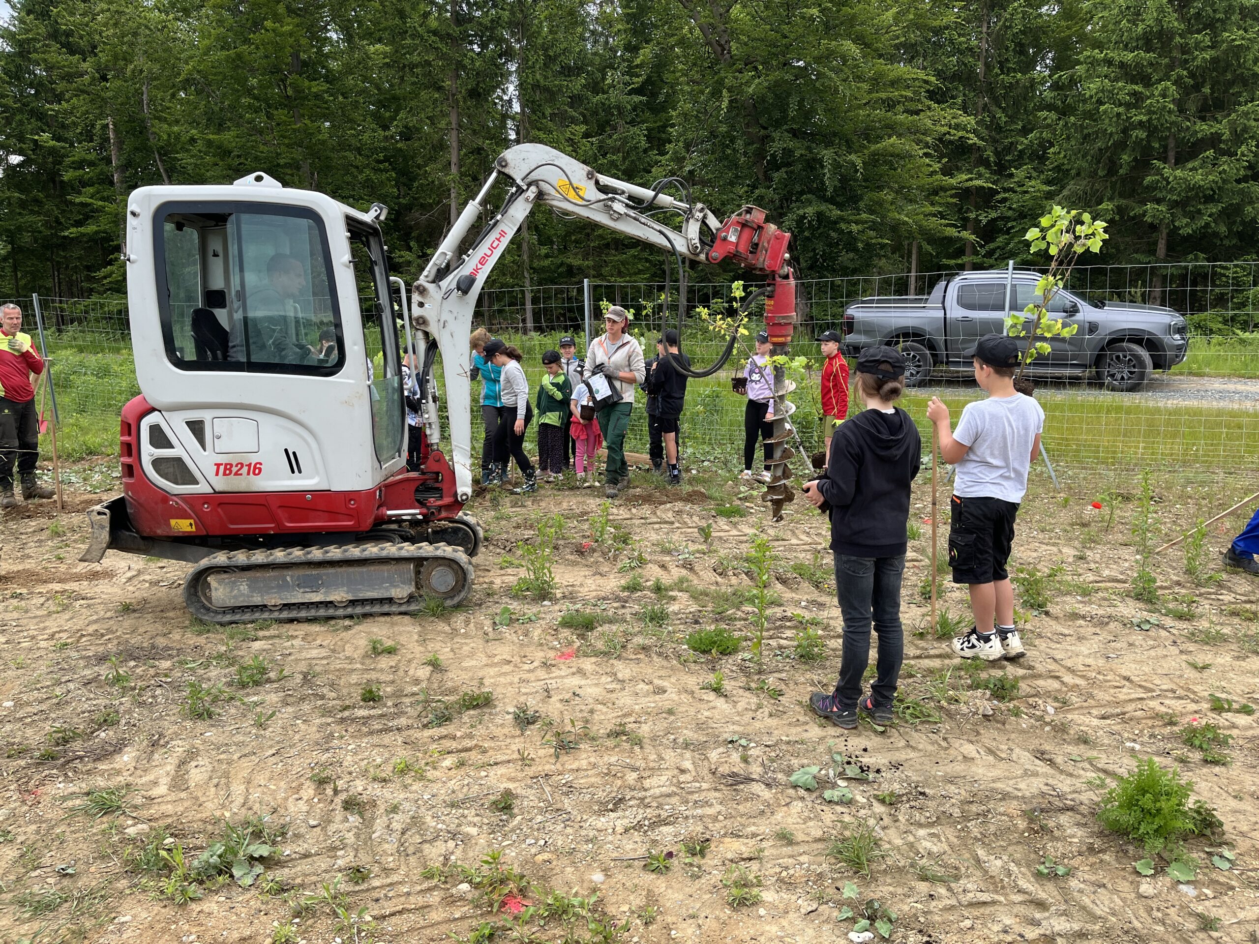 Že kmalu bomo lahko vozili z vlakom v komaj eni uri v Gradec! Na območju bivšega gradbišča te nove železniške proge se zdaj sadijo v velikem številu drevesa. En dopoldan so otroci 3. in 4. razreda lahko pomagali pri tem delu in si ogledali, koliko truda gre v obnovo narave po tako močnem posegu v njo.
