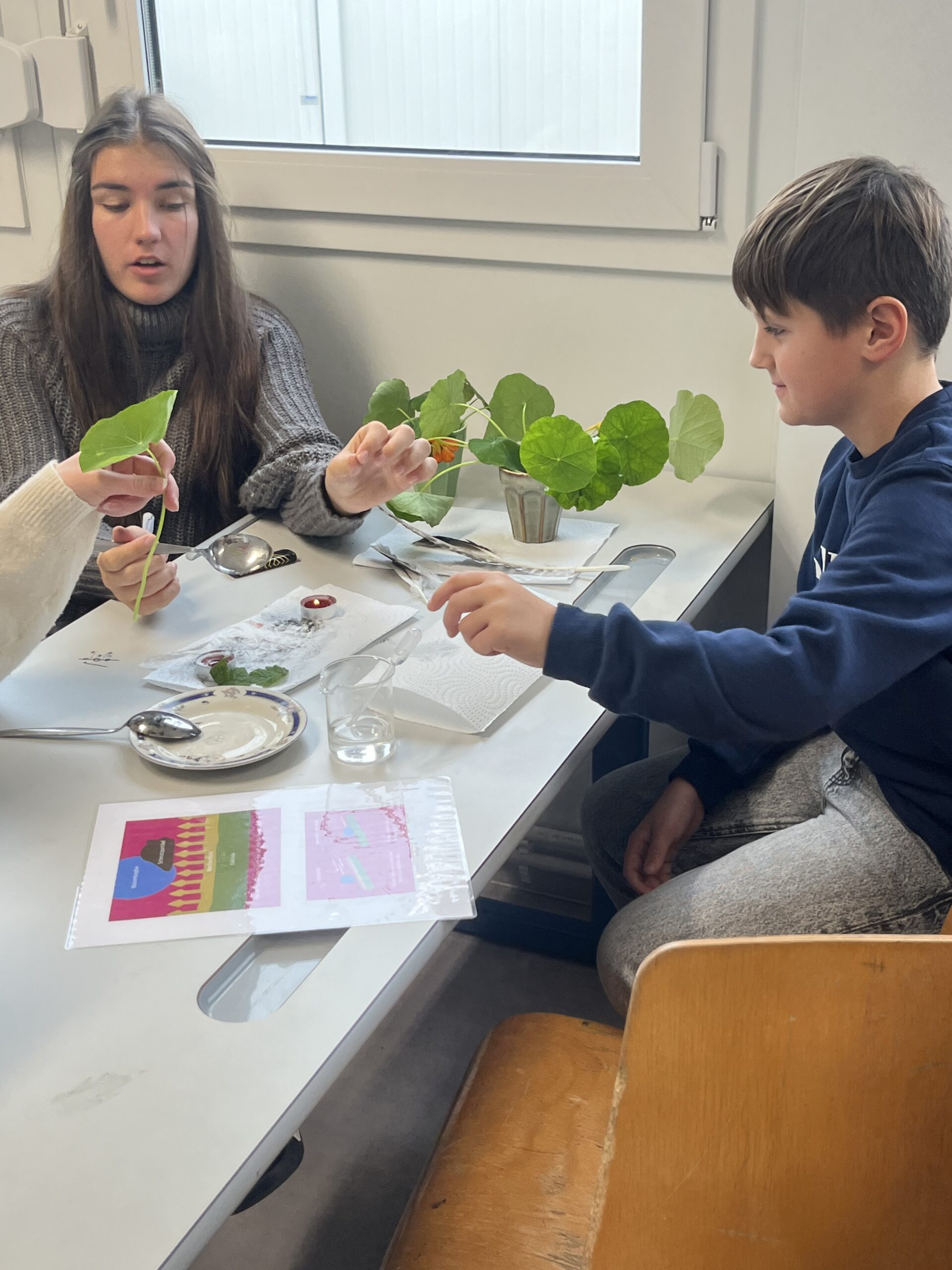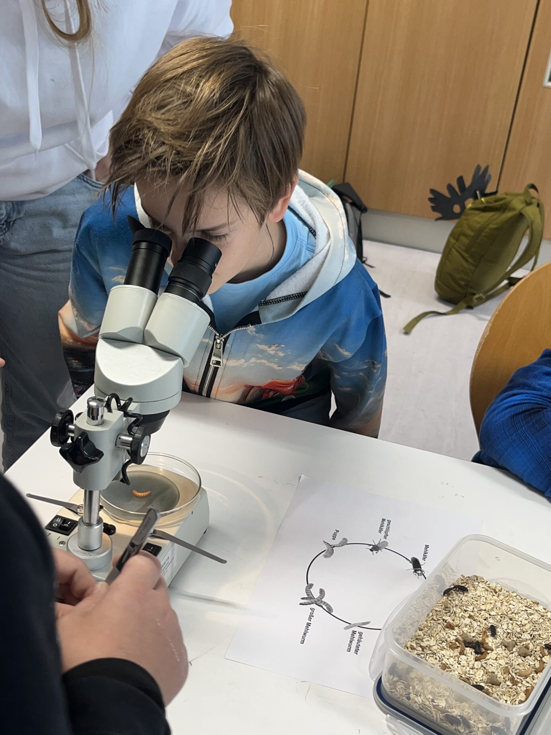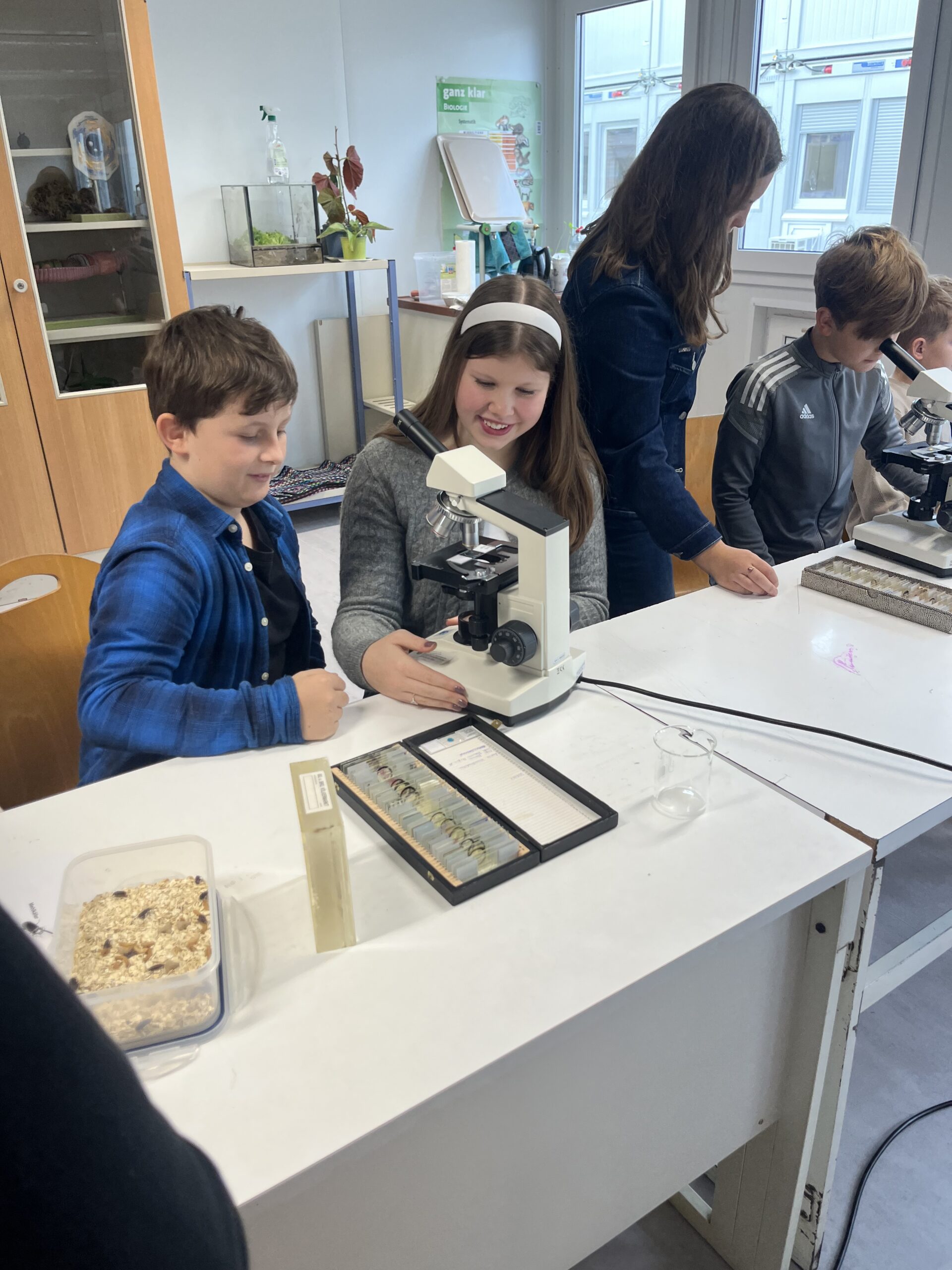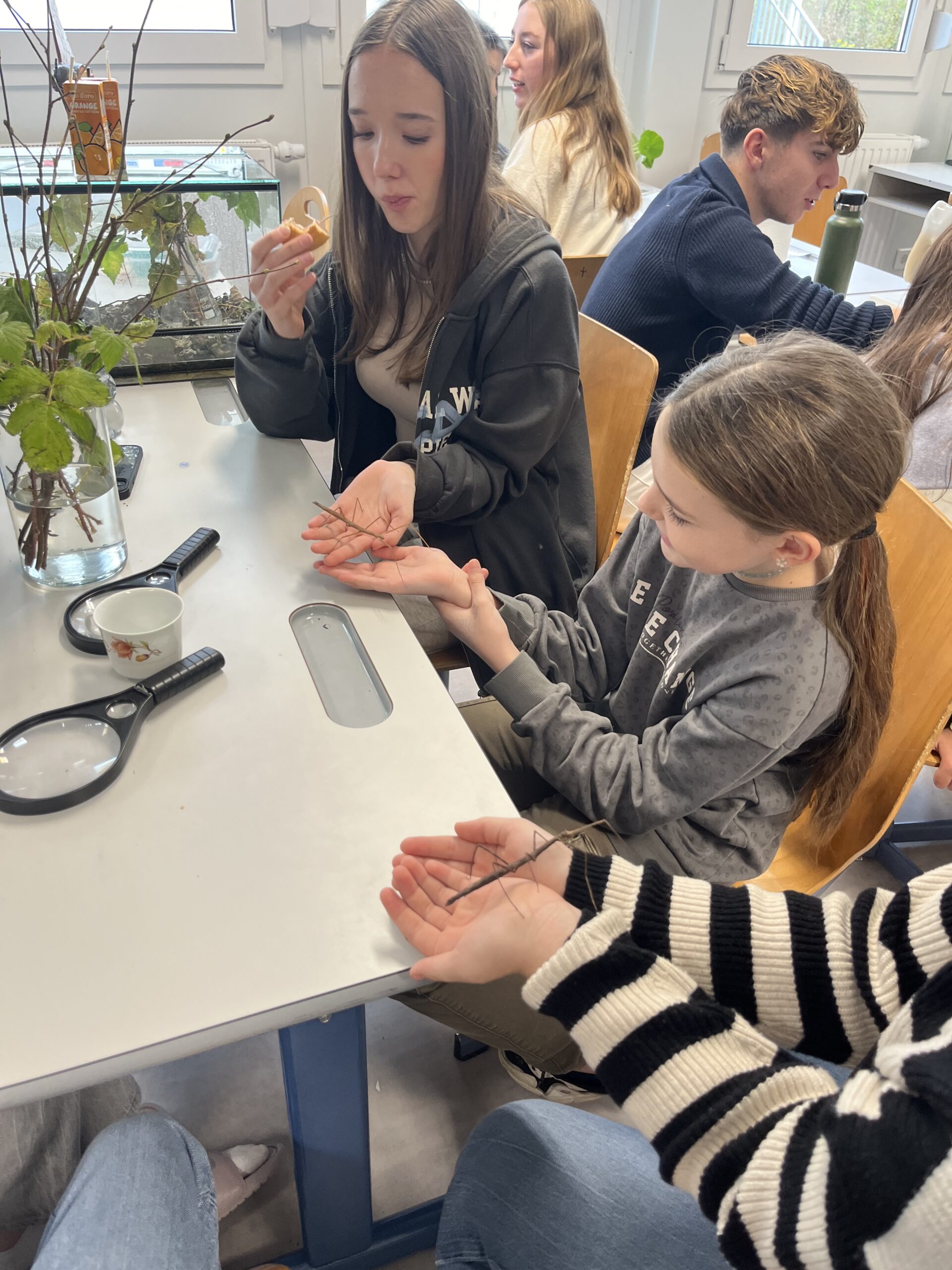 - Im Biologieraum zerschnitten wir ein Kuhauge. Wir durften Stabheuschrecken halten und mit Mikroskopen arbeiten.