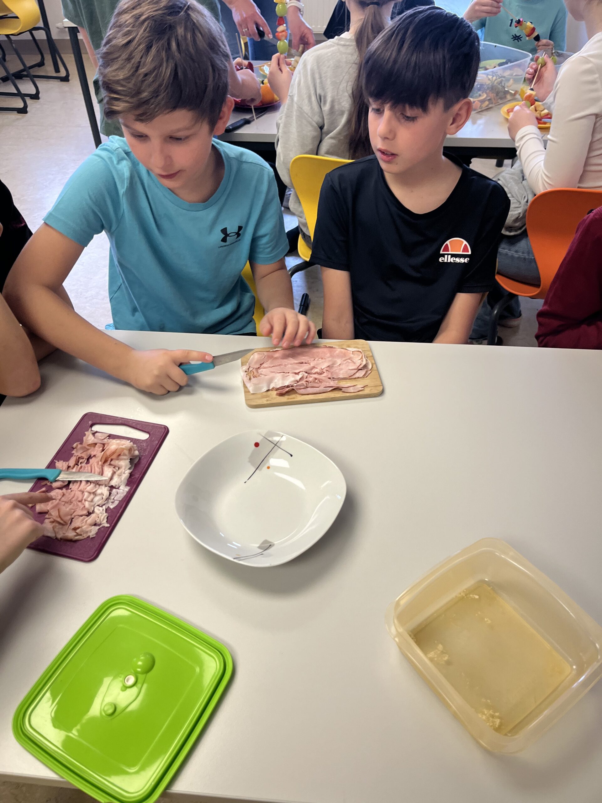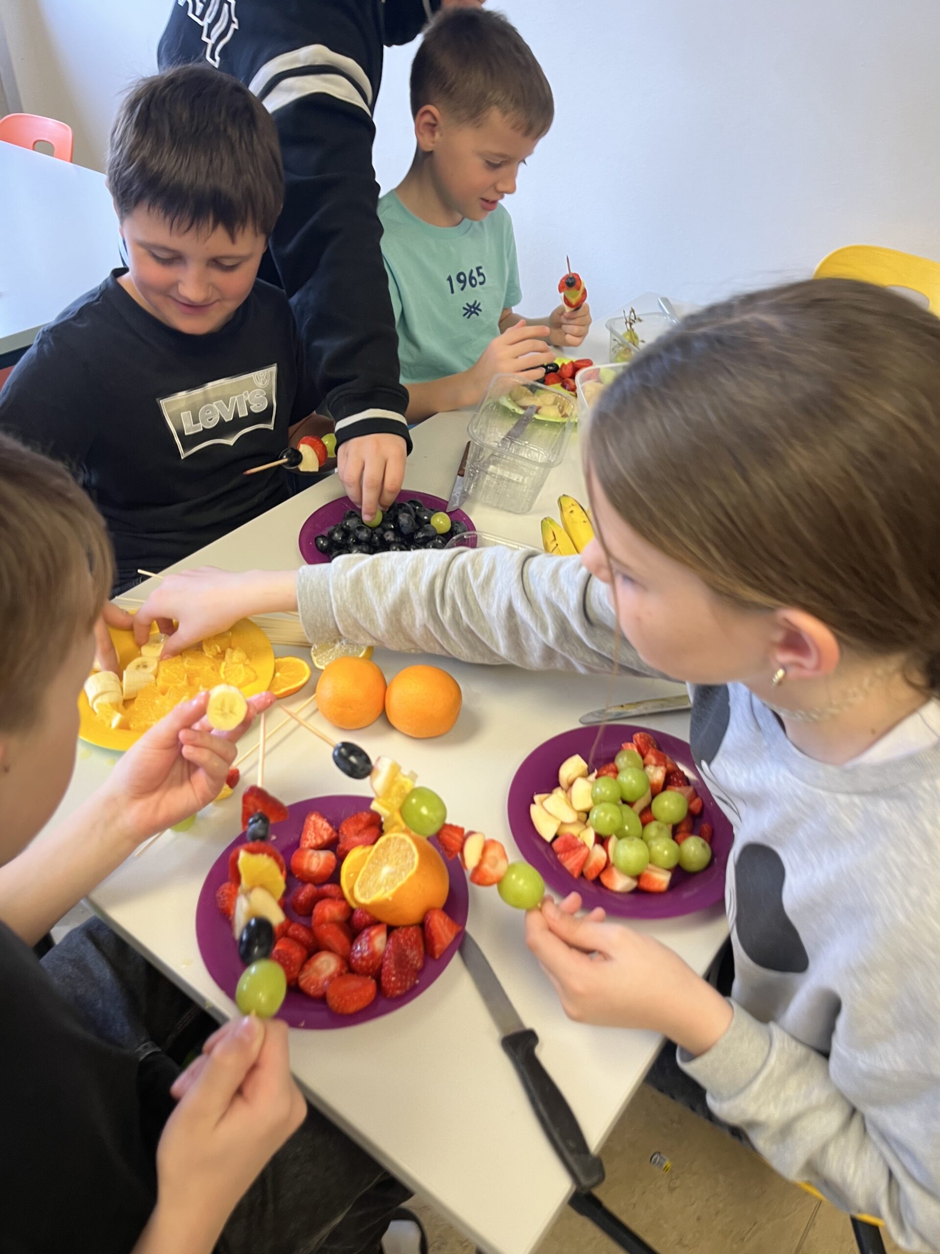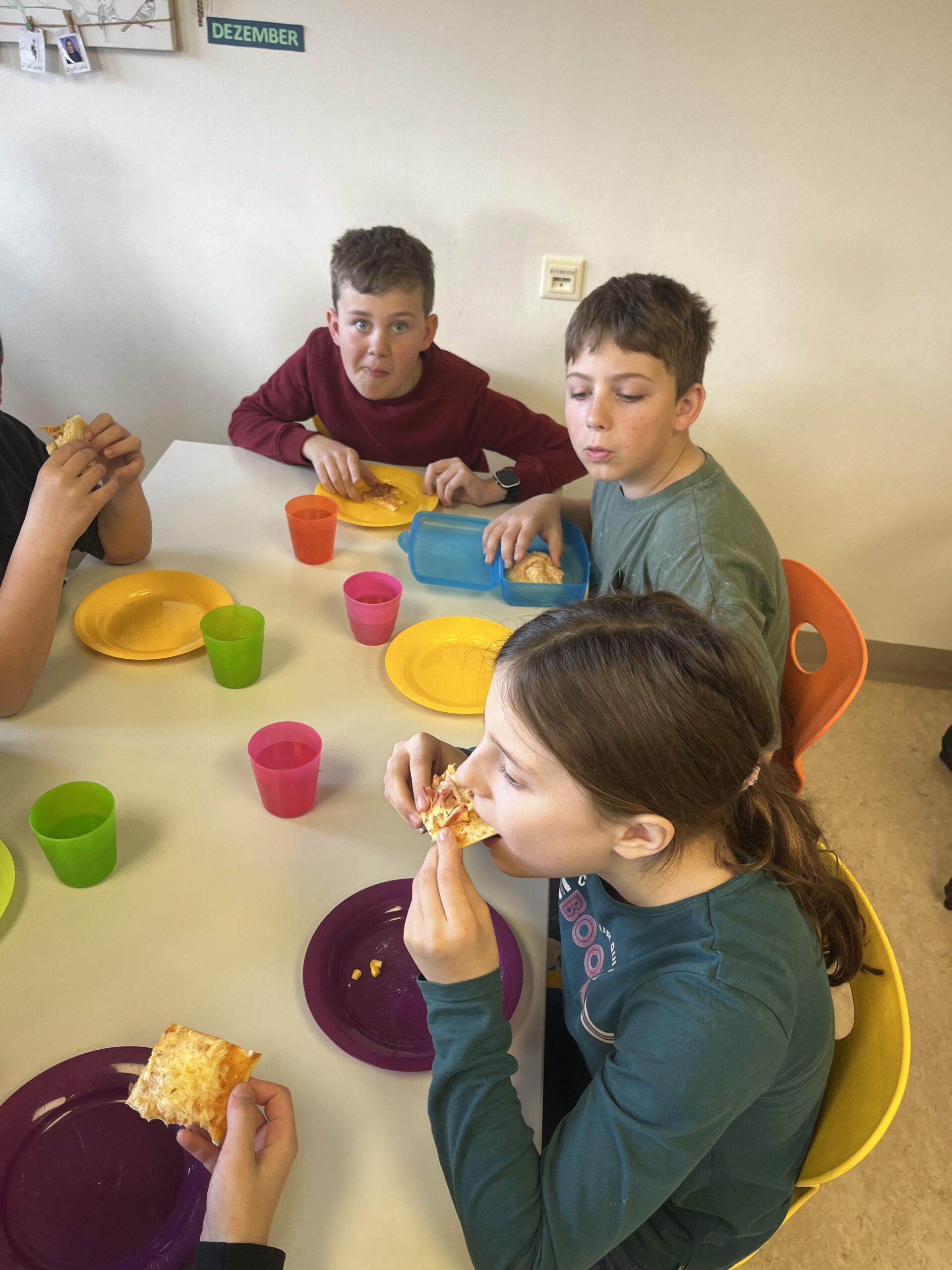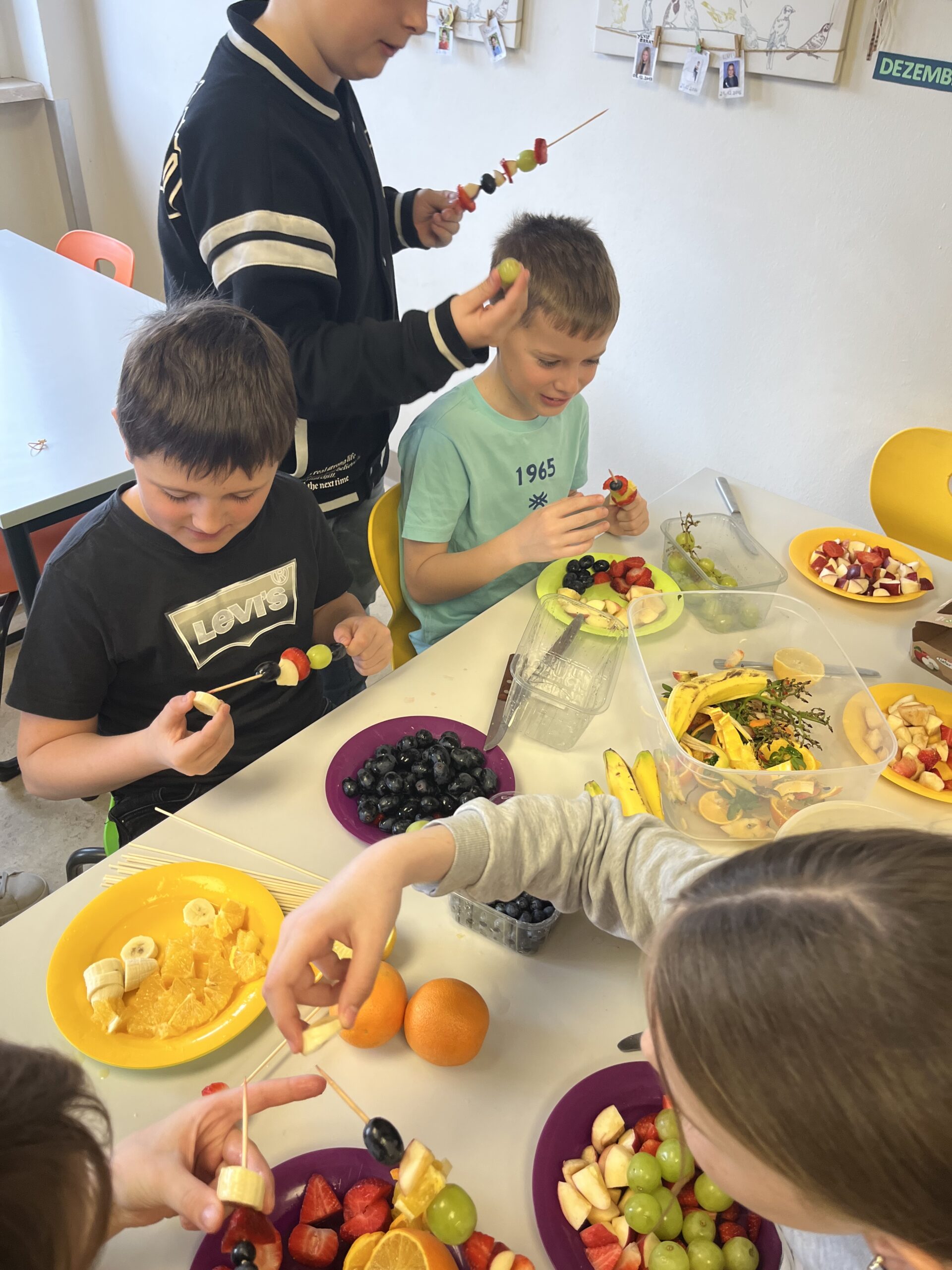 Heute durfte ein Teil der 4. Klasse unter die Pizzabäcker gehen. Die ganze Zubereitung wurde von den Schülern durchgeführt. Da aber der Pizzateig etwas Zeit zum Rasten braucht, hat ihn unsere Lehrerin schon vorbereitet. Der Teig wurde sorgfältig ausgerollt und mit selbstgemachter Tomatensauce bestrichen. Danach belegten wird ihn mit Käse, Schinken und Mais. Natürlich durften leckere Pizzagewürze nicht fehlen. Danach wurde die Pizza im Backrohr gebacken. In der Zwischenzeit bereitete der zweite Teil der Klasse Obstspieße vor. Bananen, Äpfel, Trauben, Erdbeeren, Orangen, Heidelbeeren alles was uns nur geschmeckt hat, steckten wir zu leckeren Spießen zusammen.