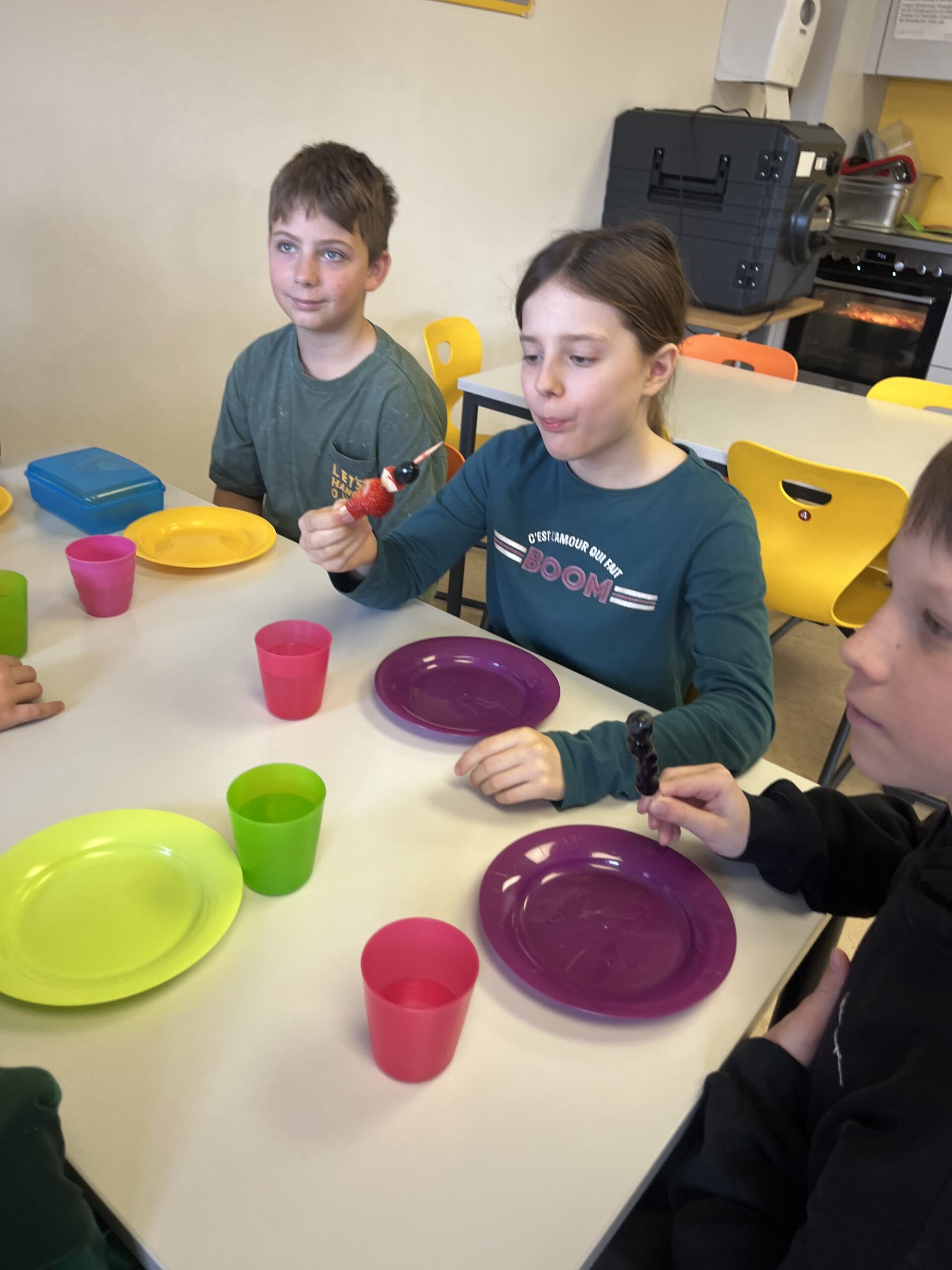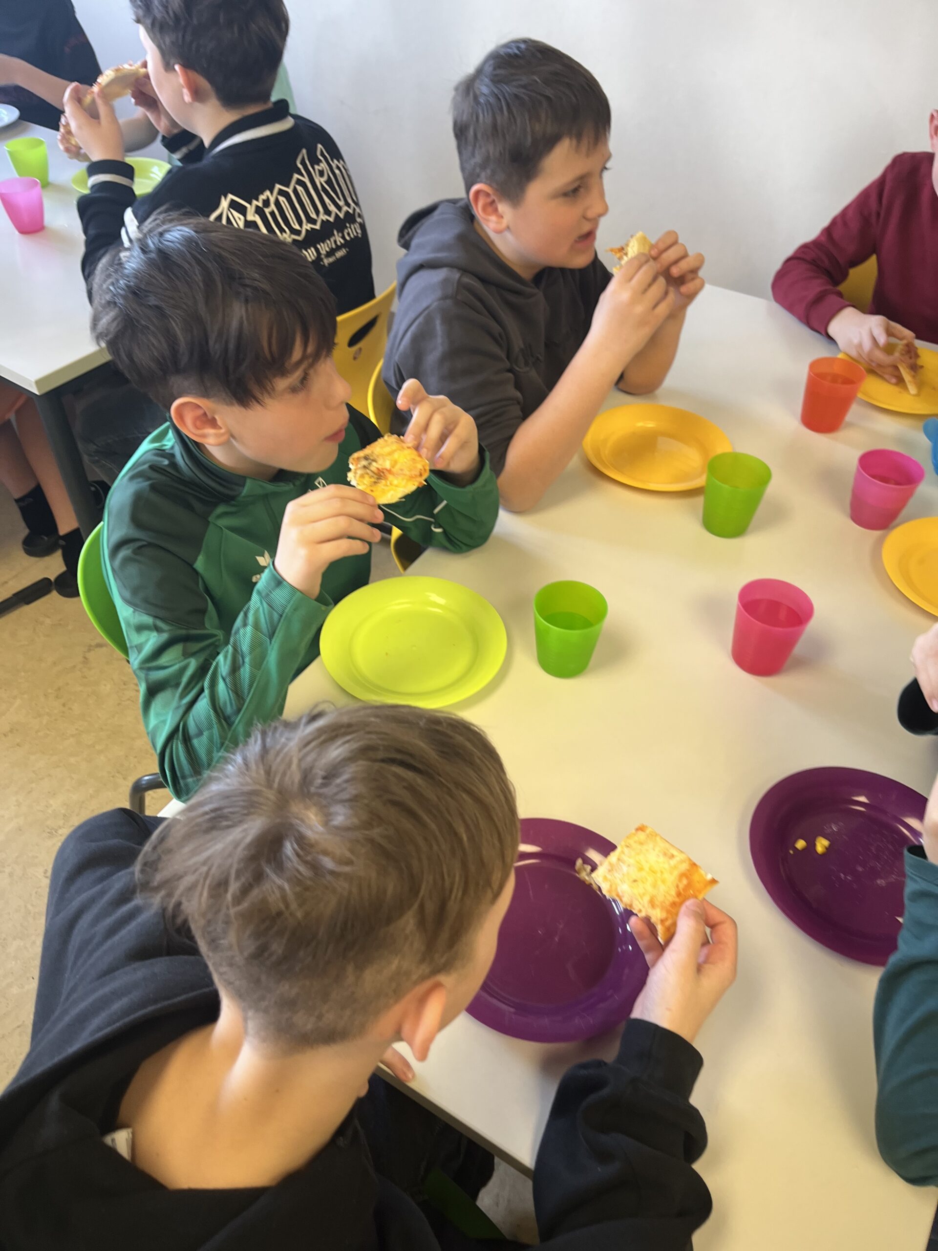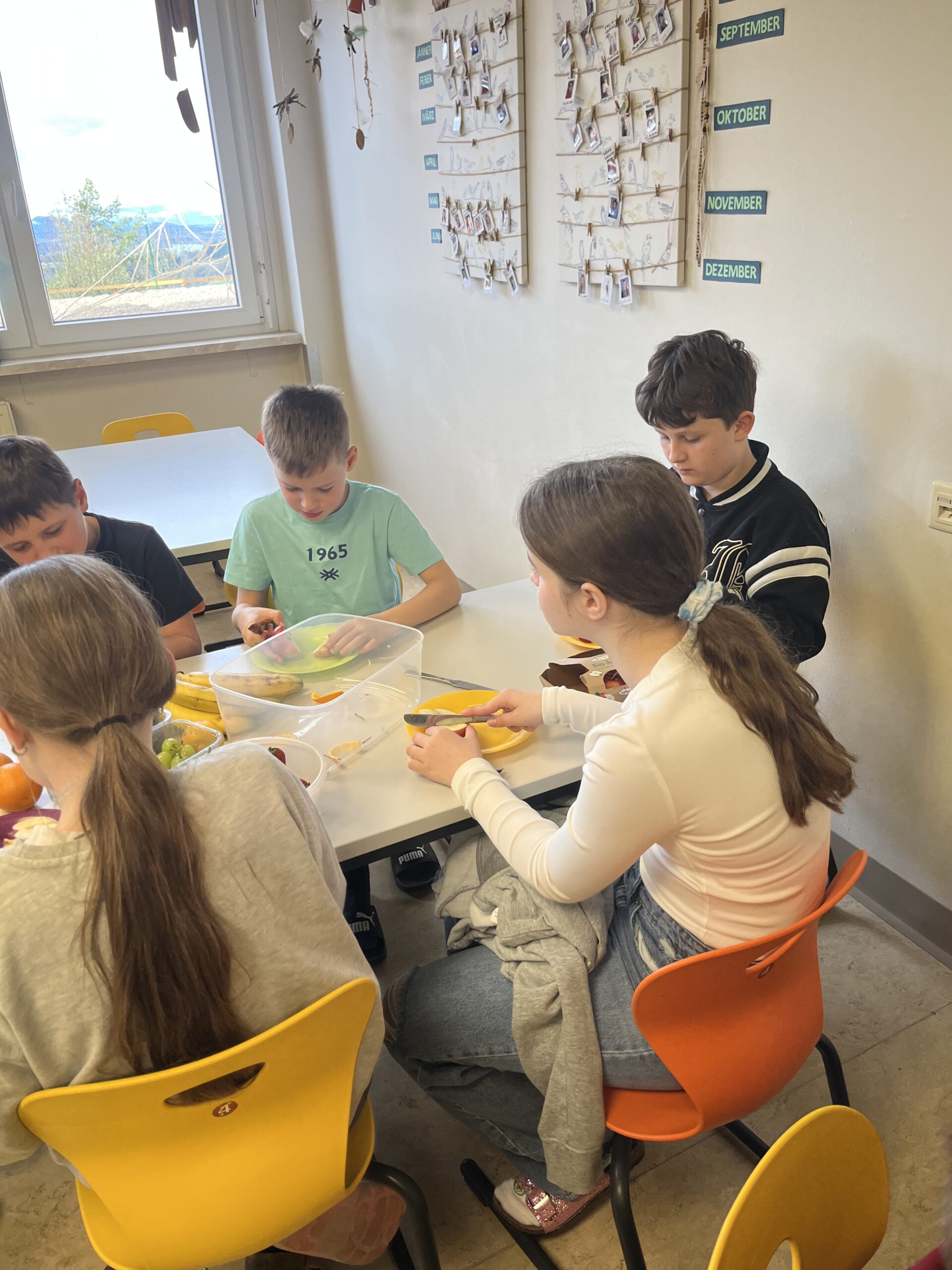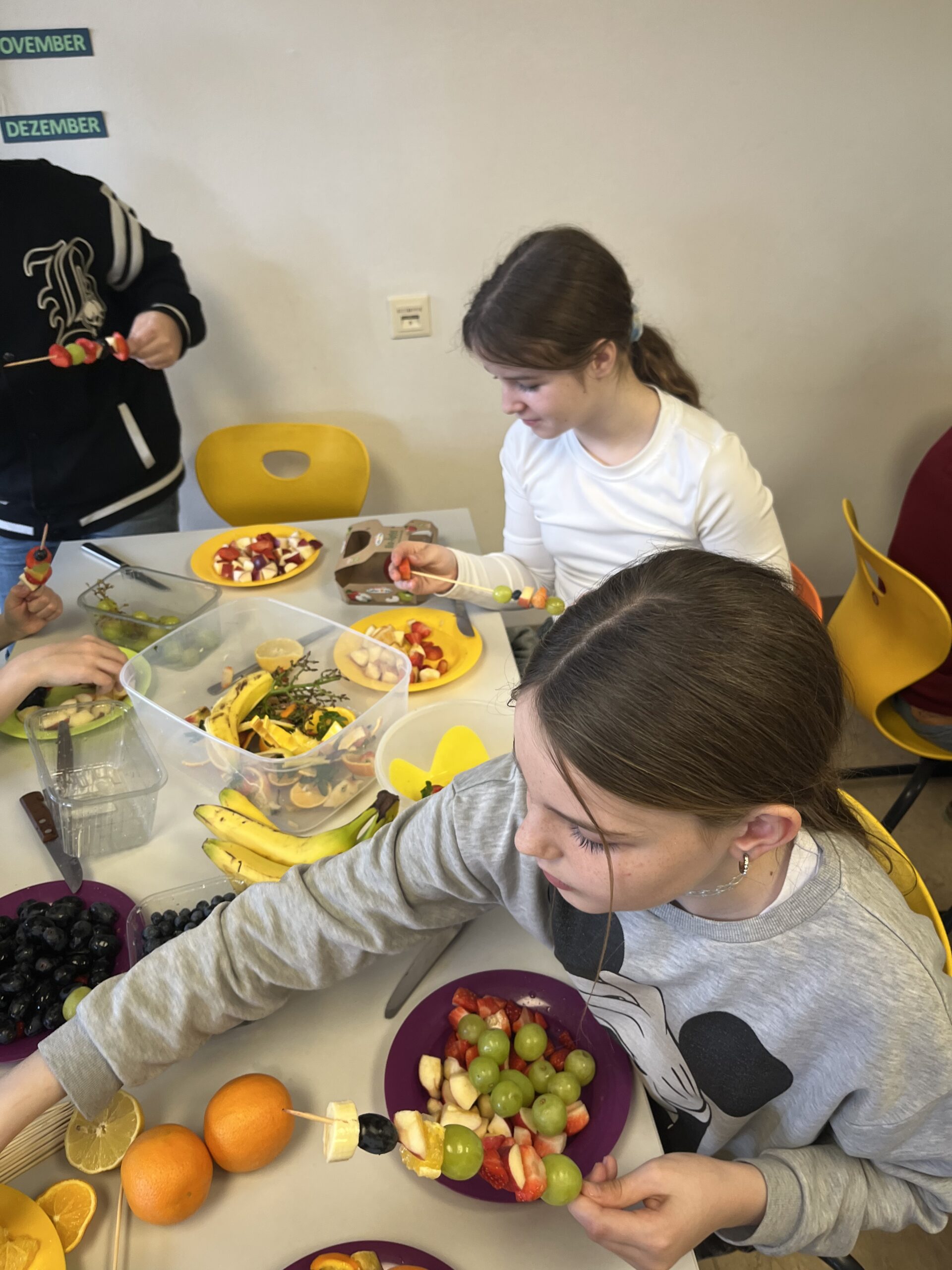 Heute durfte ein Teil der 4. Klasse unter die Pizzabäcker gehen. Die ganze Zubereitung wurde von den Schülern durchgeführt. Da aber der Pizzateig etwas Zeit zum Rasten braucht, hat ihn unsere Lehrerin schon vorbereitet. Der Teig wurde sorgfältig ausgerollt und mit selbstgemachter Tomatensauce bestrichen. Danach belegten wird ihn mit Käse, Schinken und Mais. Natürlich durften leckere Pizzagewürze nicht fehlen. Danach wurde die Pizza im Backrohr gebacken. In der Zwischenzeit bereitete der zweite Teil der Klasse Obstspieße vor. Bananen, Äpfel, Trauben, Erdbeeren, Orangen, Heidelbeeren alles was uns nur geschmeckt hat, steckten wir zu leckeren Spießen zusammen.