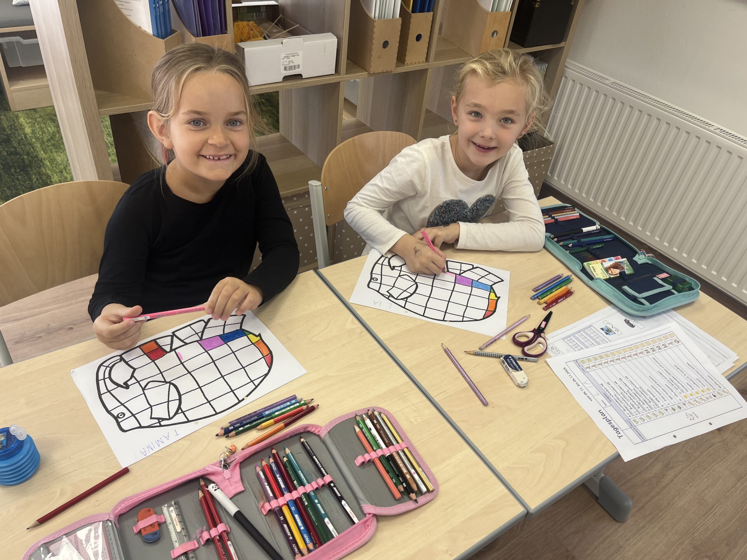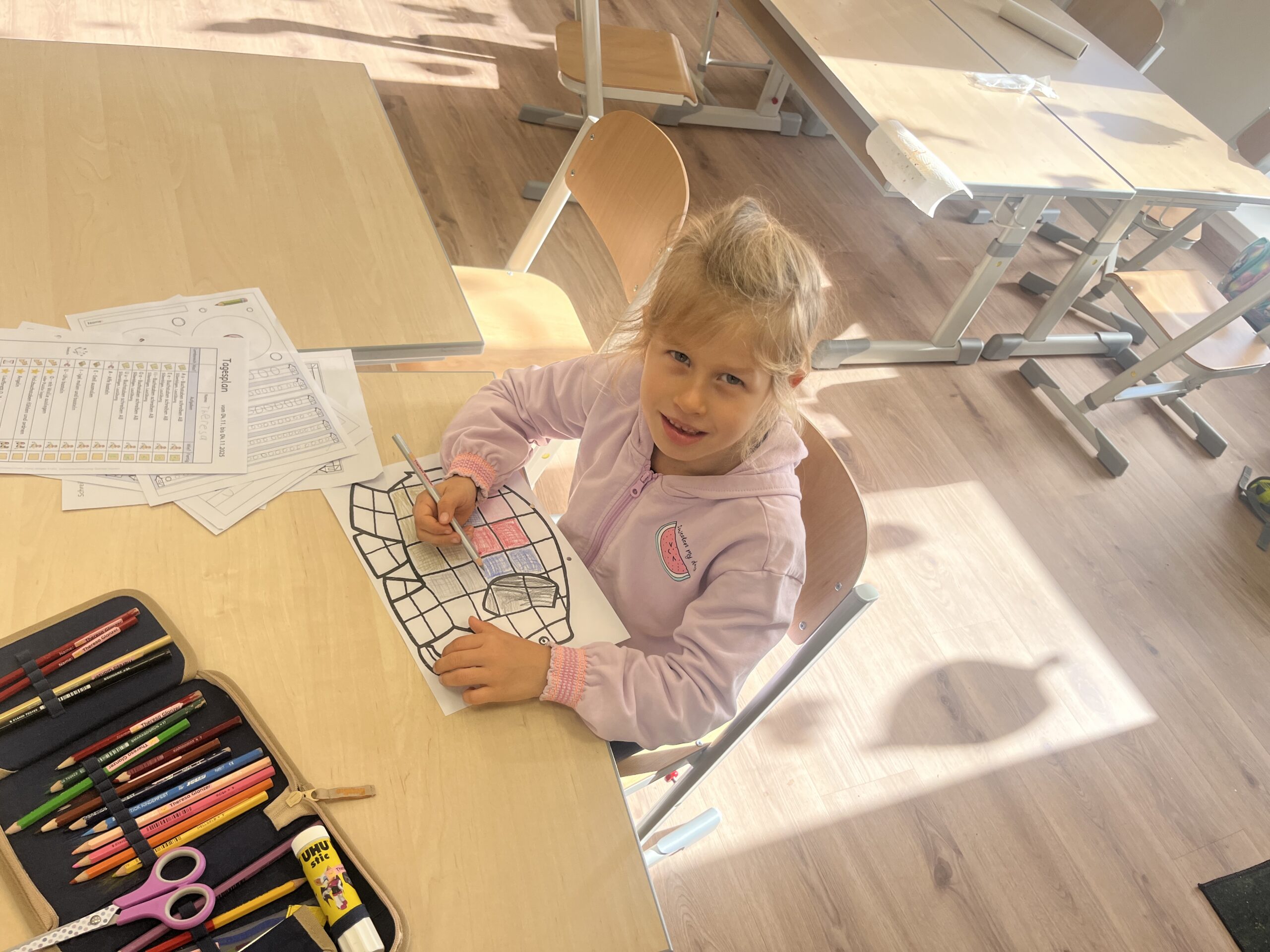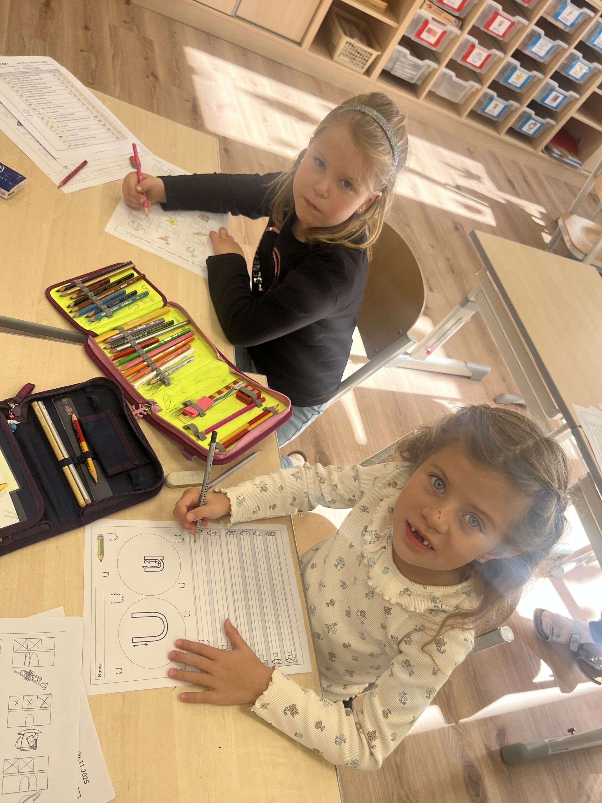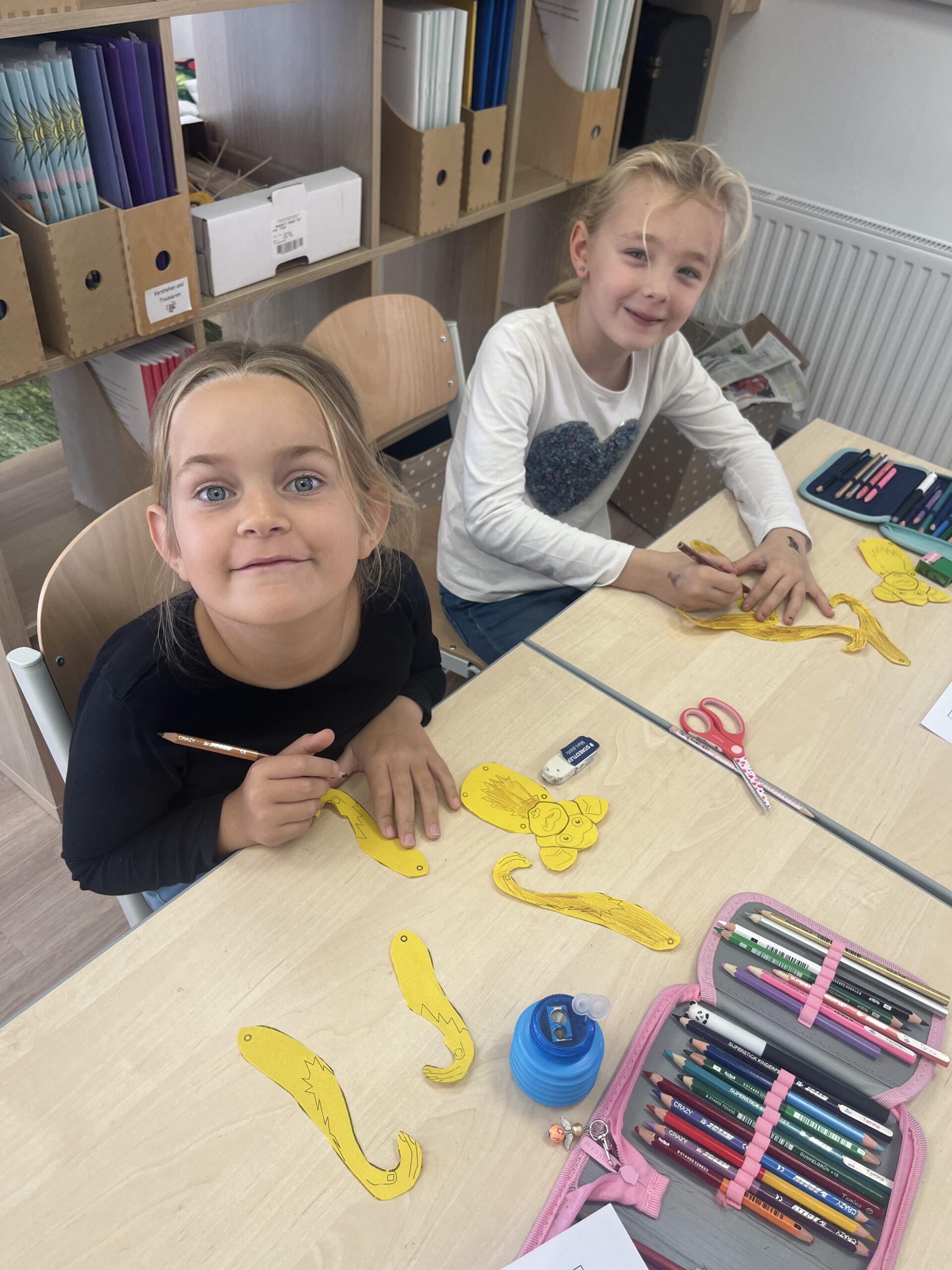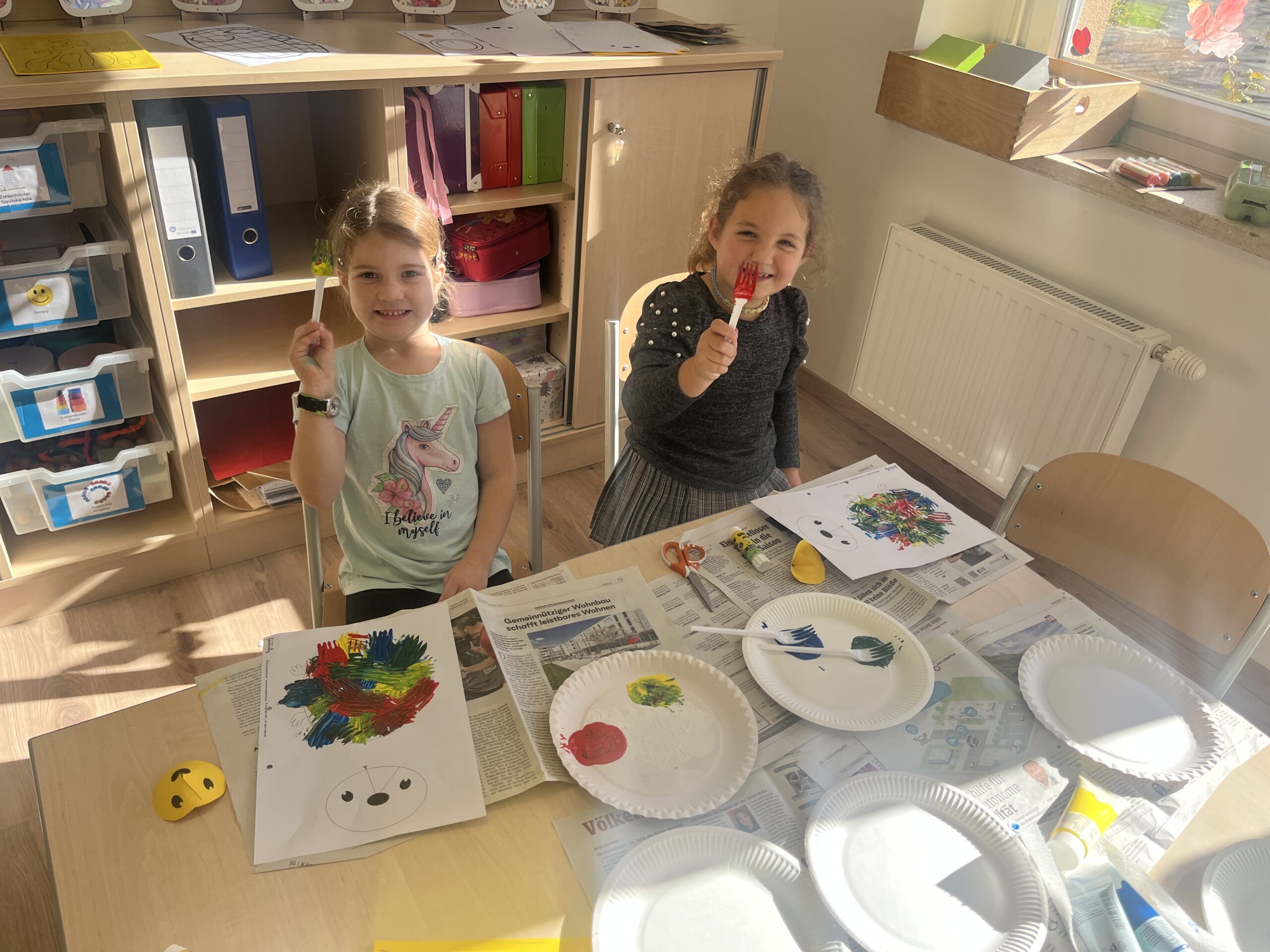 Die Kinder bastelten voll Eifer und Motivation und entdecken spielerisch, wie wichtig die Selbstlaute für unsere Sprache sind. Zur Belohnung gab es in der Pause einen leckeren A wie Apfelkuchen mit O wie Orangensaft.